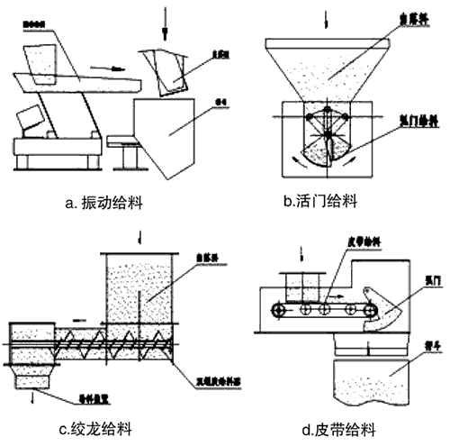 圖1中一部分也可以根據(jù)物料特性相互結(jié)合起來使用,通過在各種給料結(jié)構(gòu)上采取相應(yīng)措施產(chǎn)生符合要求的粗細(xì)給料組合,例如利用振動和活門給料結(jié)合,利用給料槽的不同尺寸,利用絞龍或皮帶電機(jī)的不同速度等。 其中給料裝置結(jié)構(gòu)形式較多,主要有:電磁(電機(jī))振動式、重力(活門或插板)式、螺旋(絞龍)推進(jìn)式、皮帶輸送式、強(qiáng)流給料等。